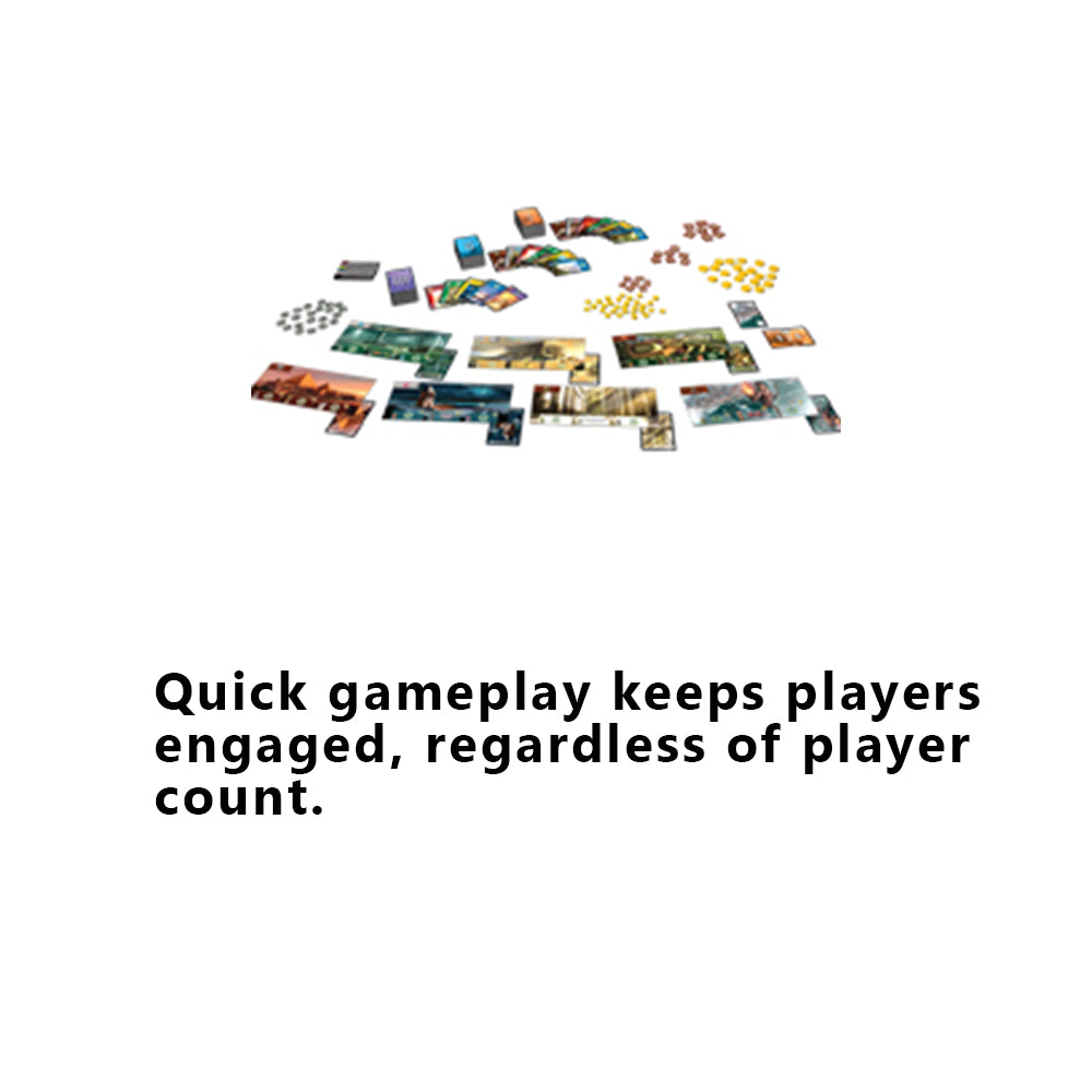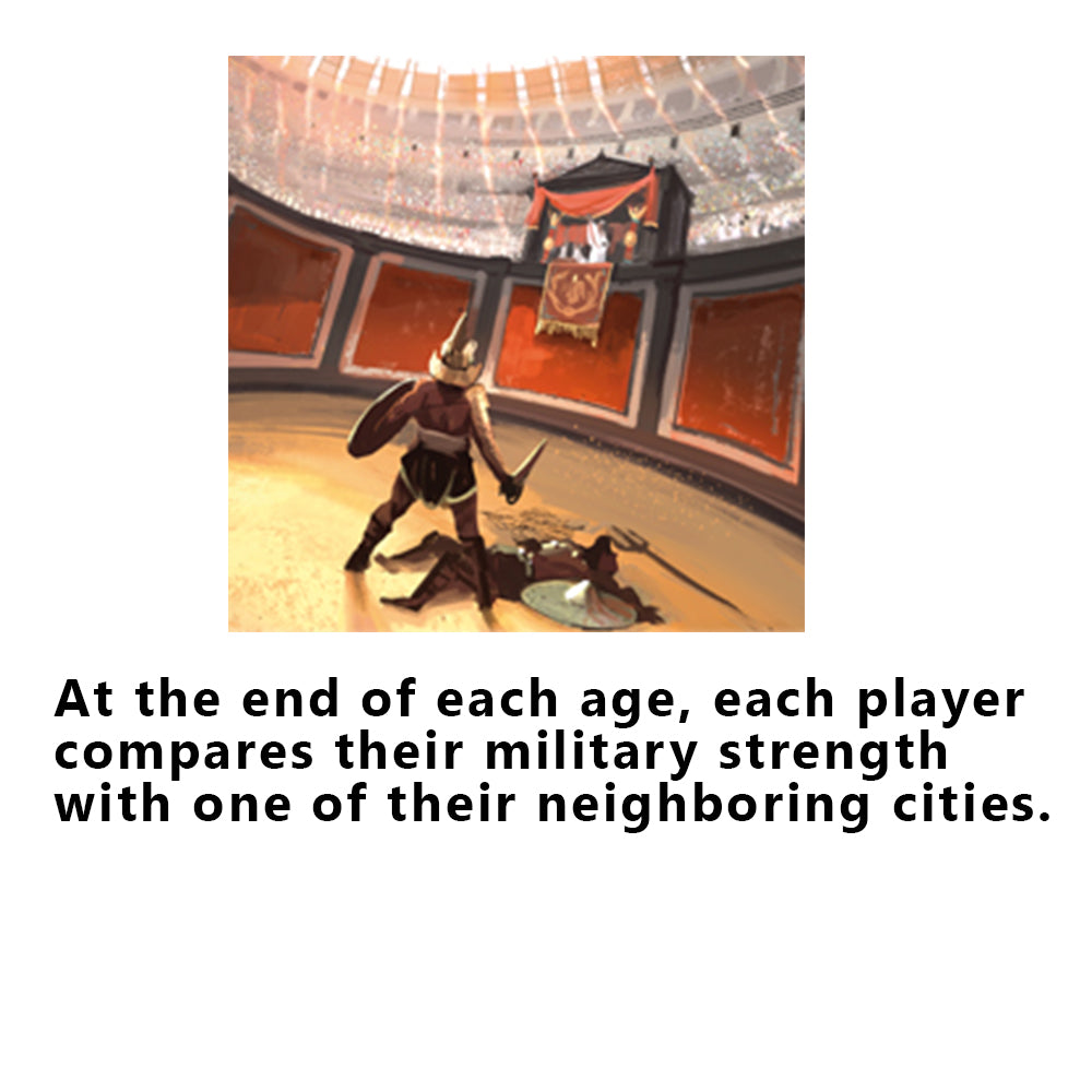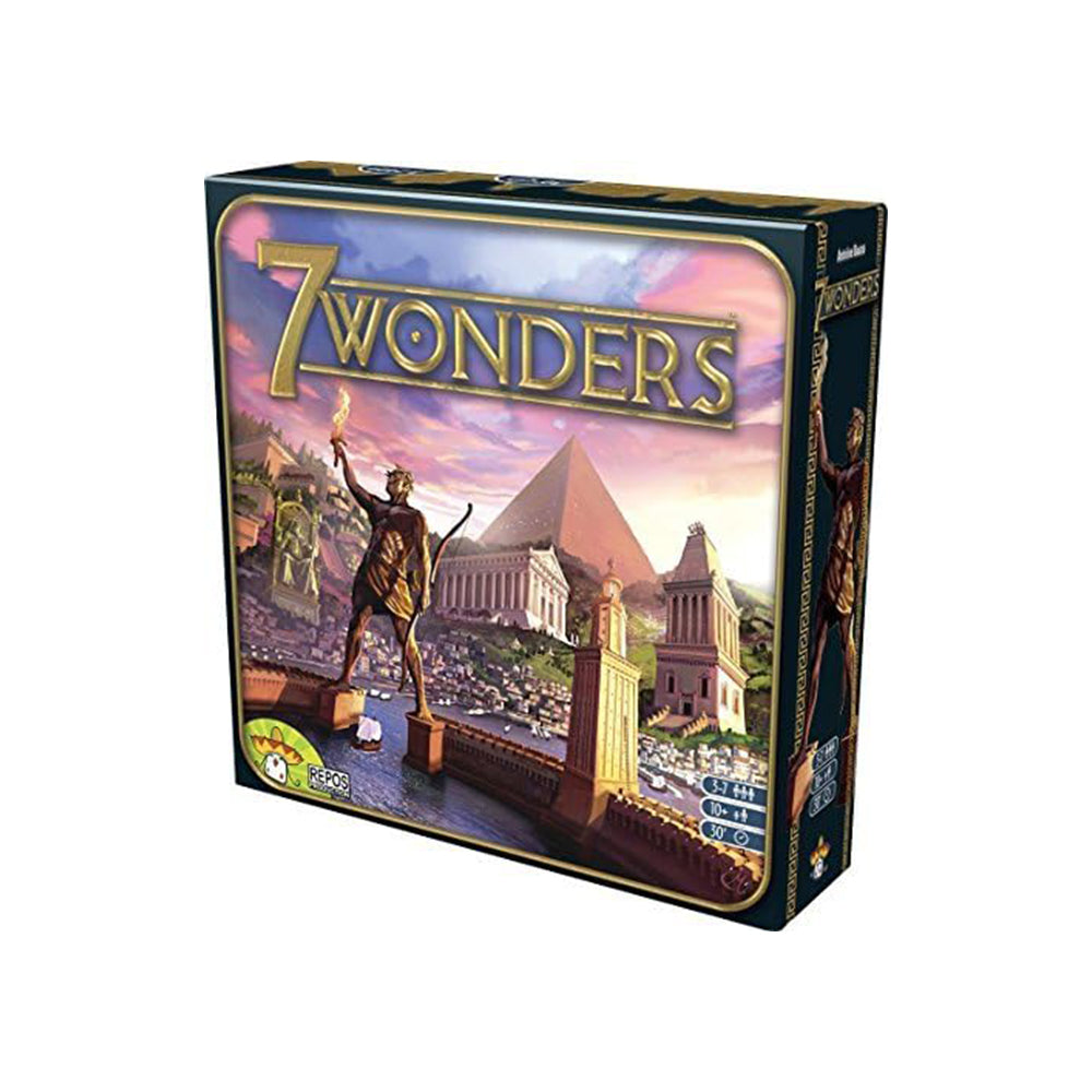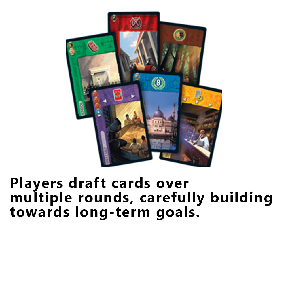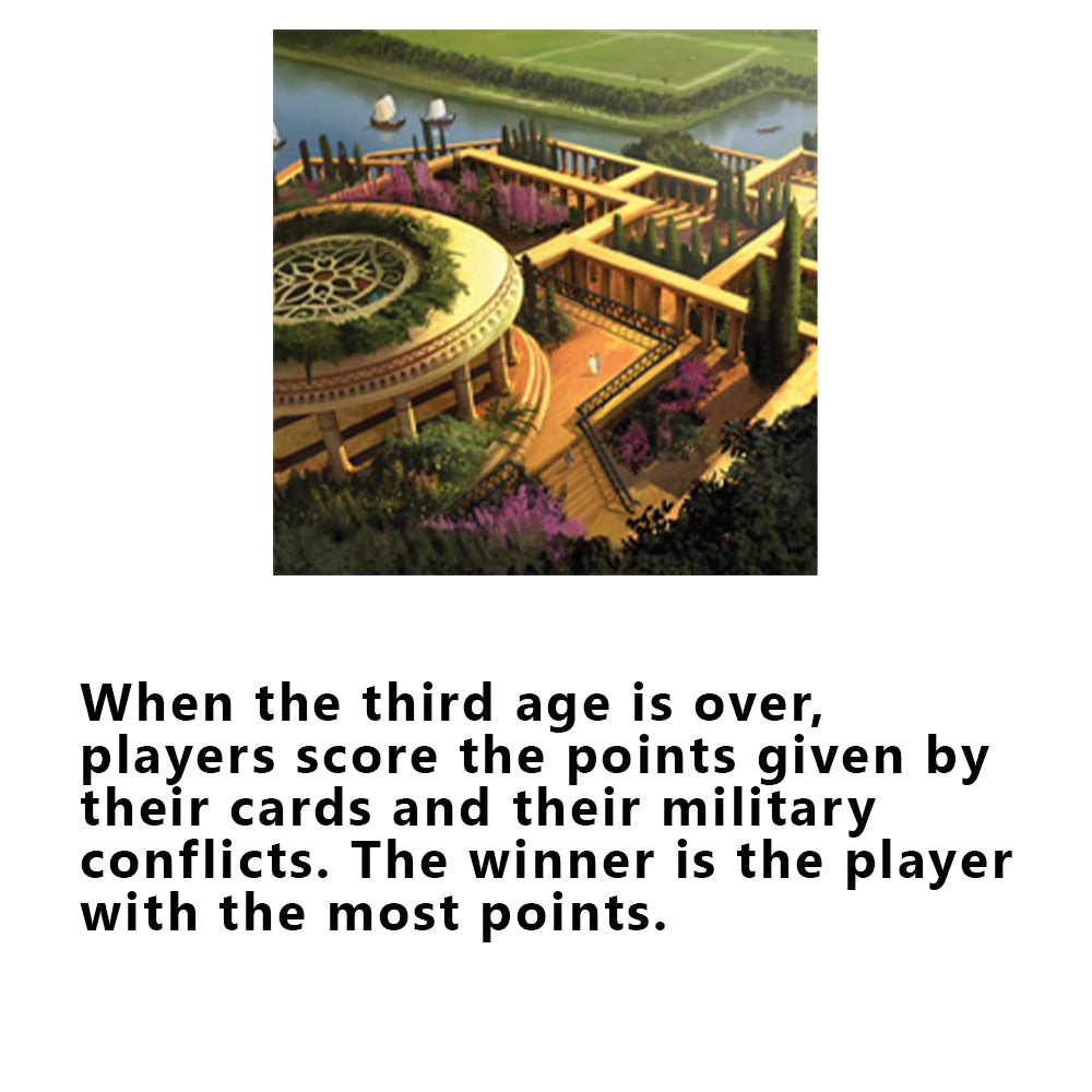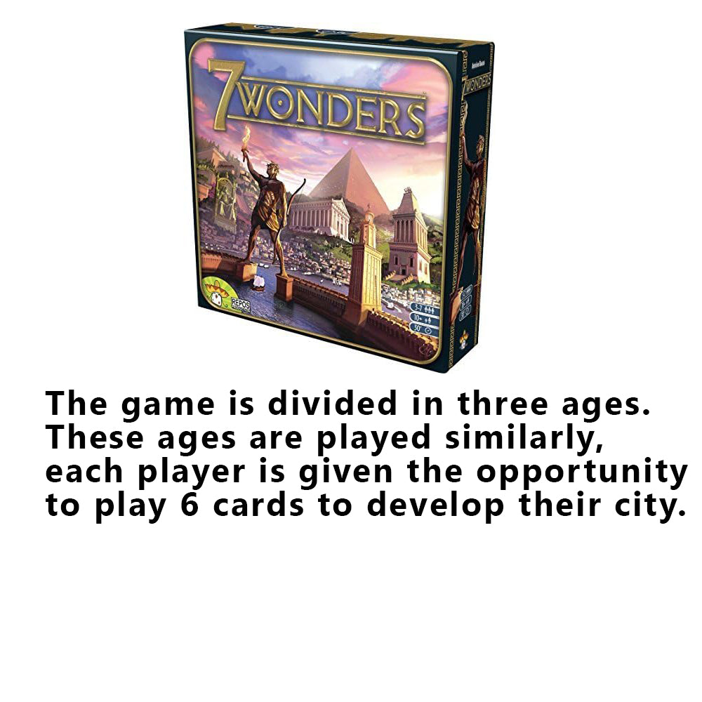 7 Wonders lasts three ages. In each age, players receive seven cards from a particular deck, choose one of those cards, then pass the remainder to an adjacent player. Players reveal their cards simultaneously, paying resources if needed or collecting resources or interacting with other players in various ways. (Players have individual boards with special powers on which to organize their cards, and the boards are double-sided). Each player then chooses another card from the deck they were passed, and the process repeats until players have six cards in play from that age. After three ages, the game ends.