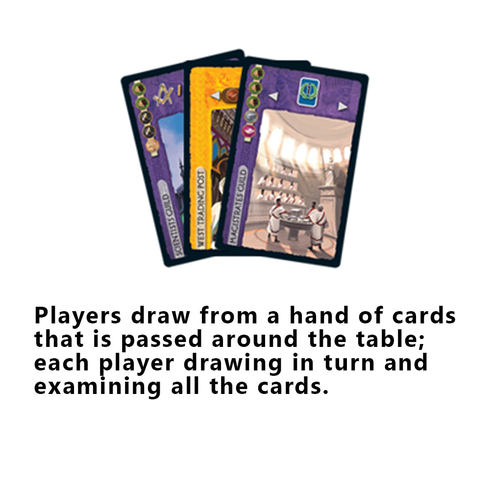 In essence, 7 Wonders is a card development game. Some cards have immediate effects, while others provide bonuses or upgrades later in the game. Some cards provide discounts on future purchases. Some provide military strength to overpower your neighbors and others give nothing but victory points. Each card is played immediately after being drafted, so you'll know which cards your neighbor is receiving and how her choices might affect what you've already built up. Cards are passed left-right-left over the three ages, so you need to keep an eye on the neighbors in both directions.