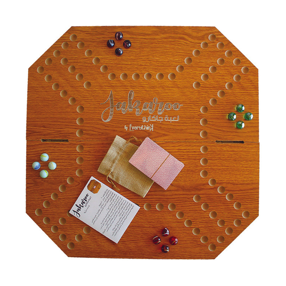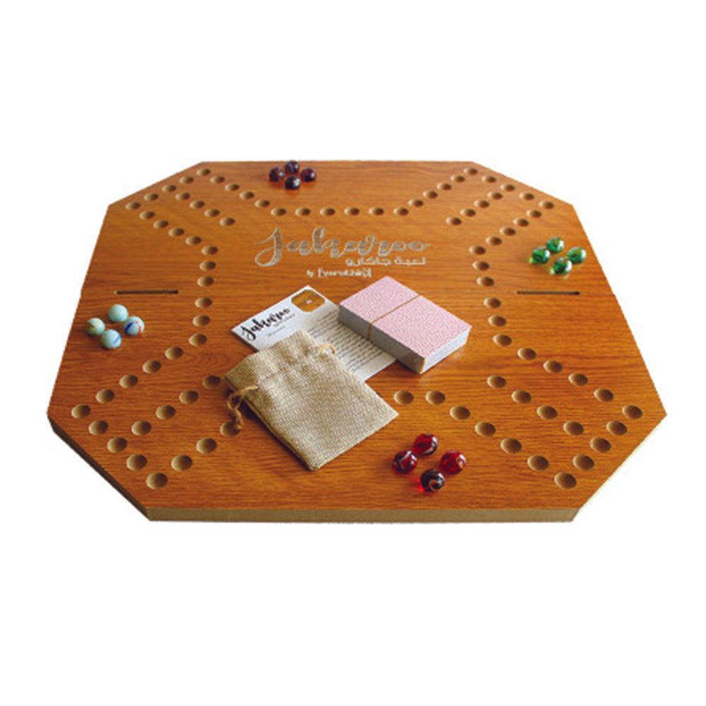 The Jackaroo game made of wooden board that contains 16 glass marbles, one deck of playing cards, and a game rules
