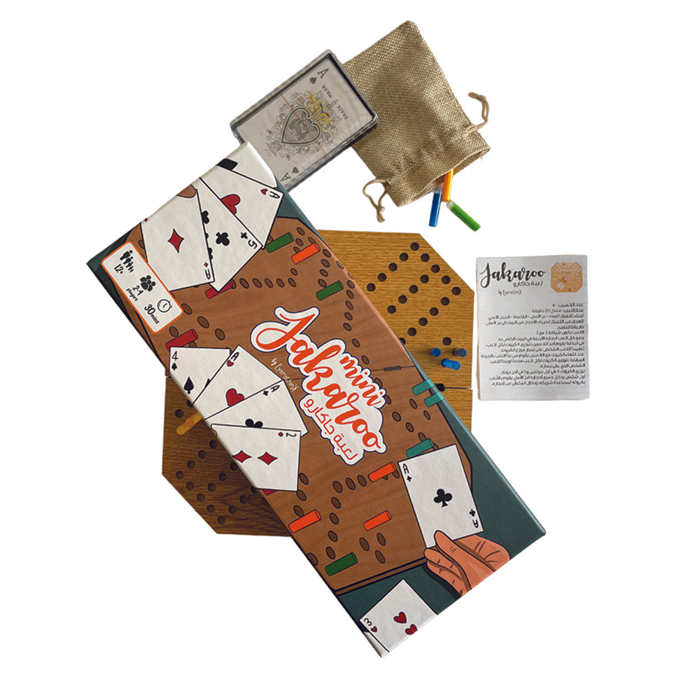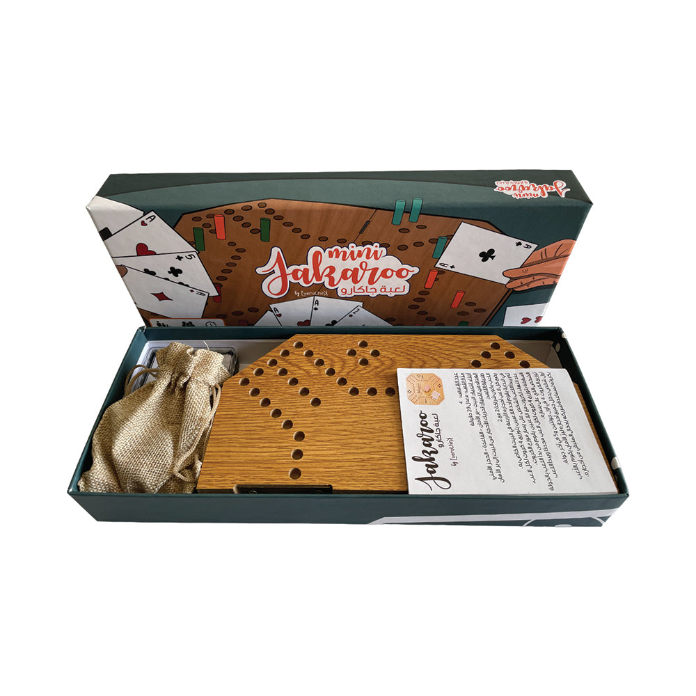 The Jackaroo game made of wooden board that contains 16 glass marbles, one deck of playing cards, and a game rules