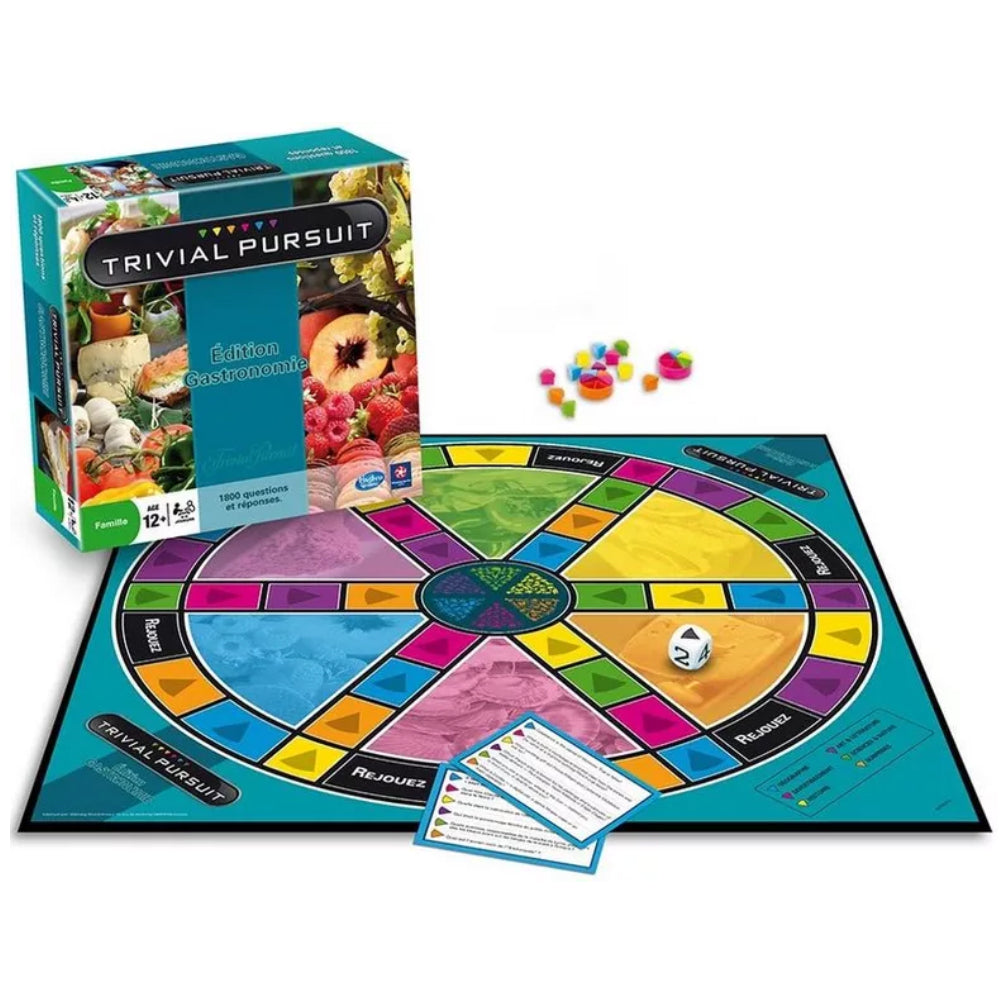 Contents: 1 board, 300 question-and-answer cards, 1 card box, 1 die, 6 camembert pieces, 36 colored marker triangles, 1 set of rules.