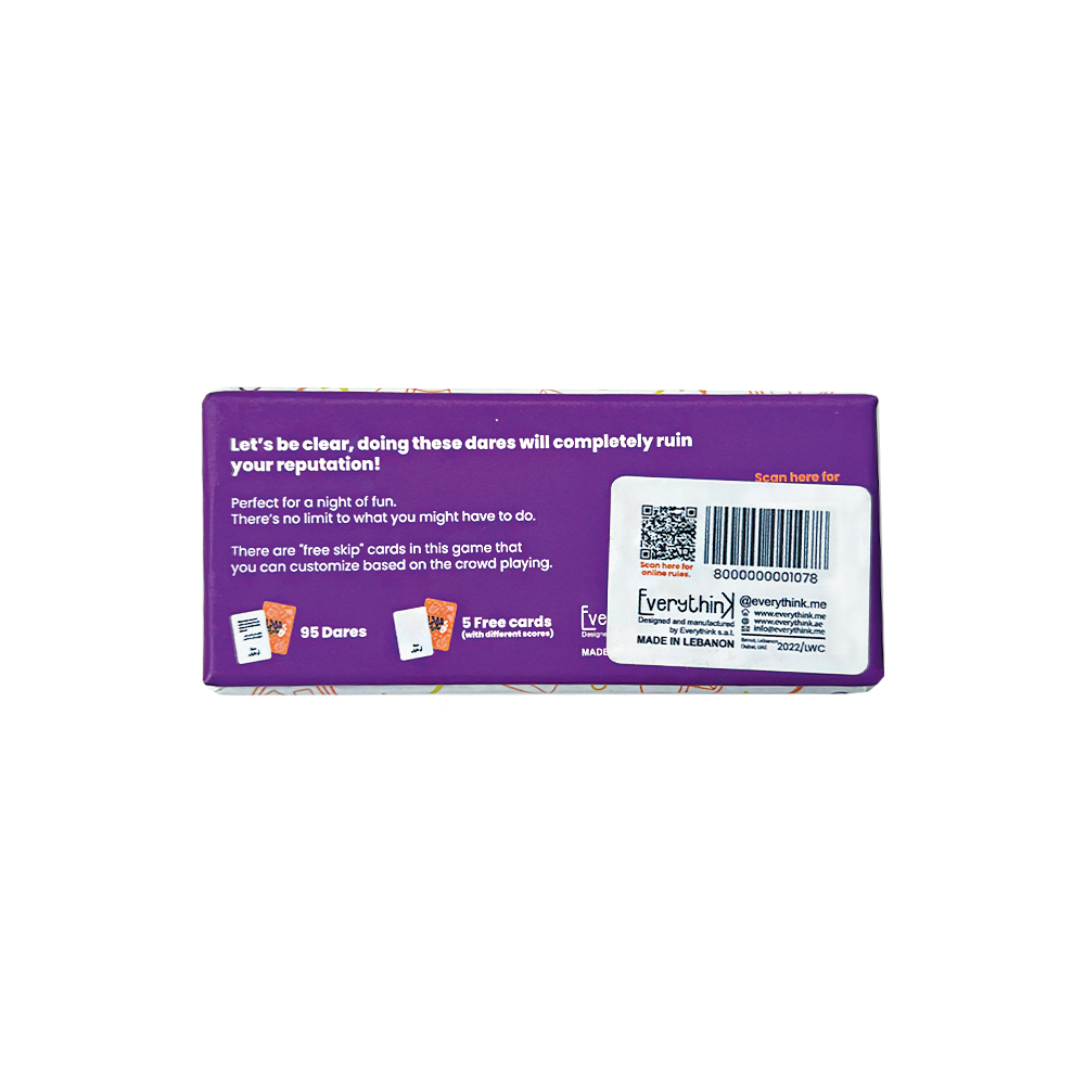 There’s no limit to what you might have to do; from Khali l Sha5ess yali 3a shmelak bi zakezkak l 30 senye to 3mol Duckface l se3a kemle this game features hysterical challenges that just keep getting wilder and wilder. There are "free skip" cards in this game - and let’s be clear, doing these dares will completely ruin your reputation! Also, since we’re speaking of company, quite honestly, the experience would be slightly ruined if you have that kind of friend in the group who gets easily offended and leaves the game the moment they’re faced with a challenge. You’ll notice, you will.
