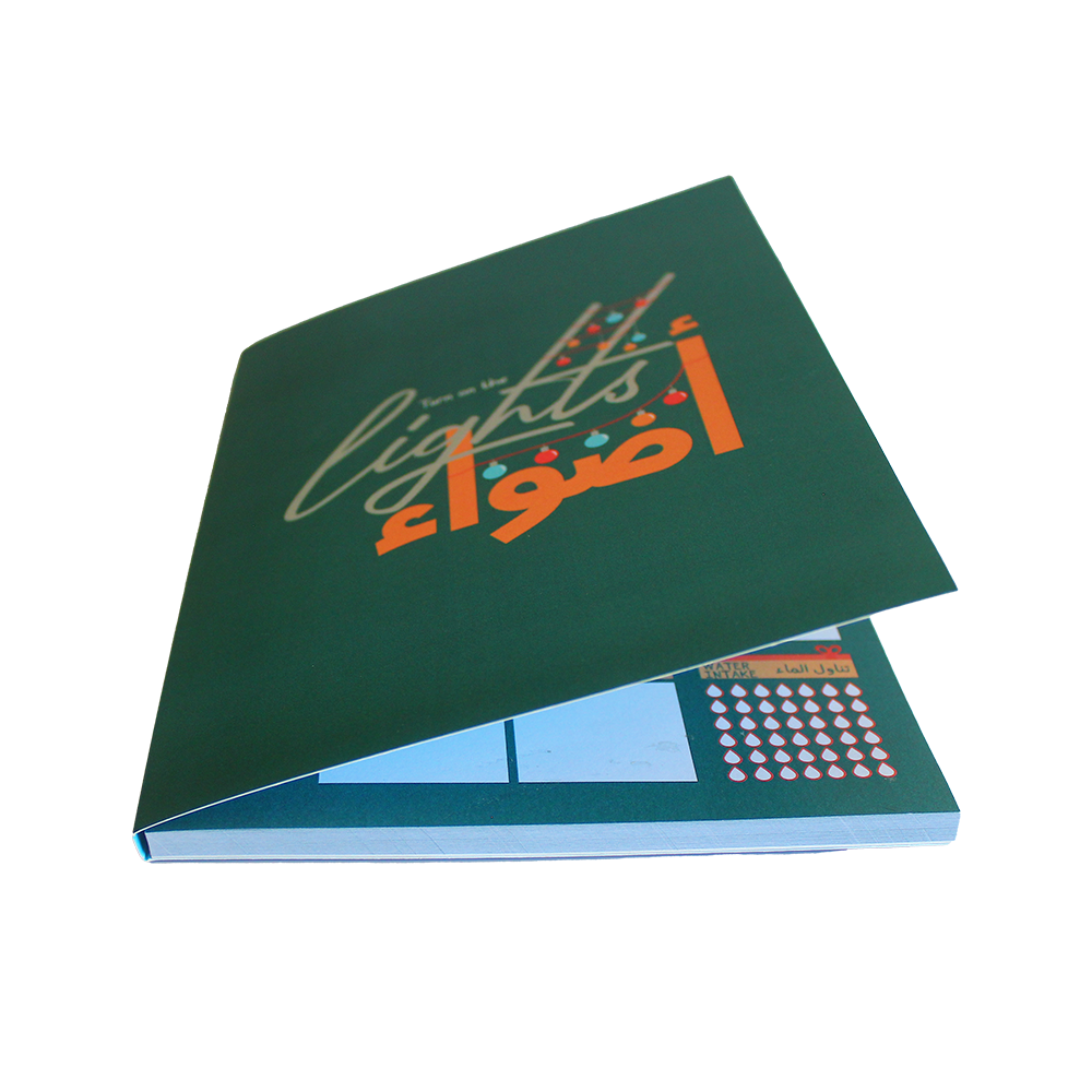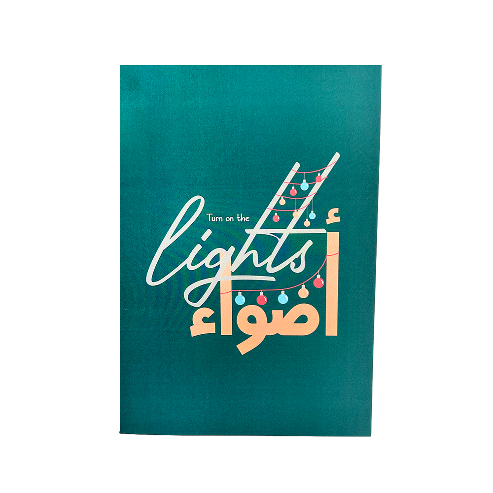 - Motivational Cover: The stunning teal-green cover features the inspiring bilingual phrase "Turn on the lights" / "أضواء", complete with a festive string light and ladder design. It's a great reminder to brighten your mood and focus on your goals.