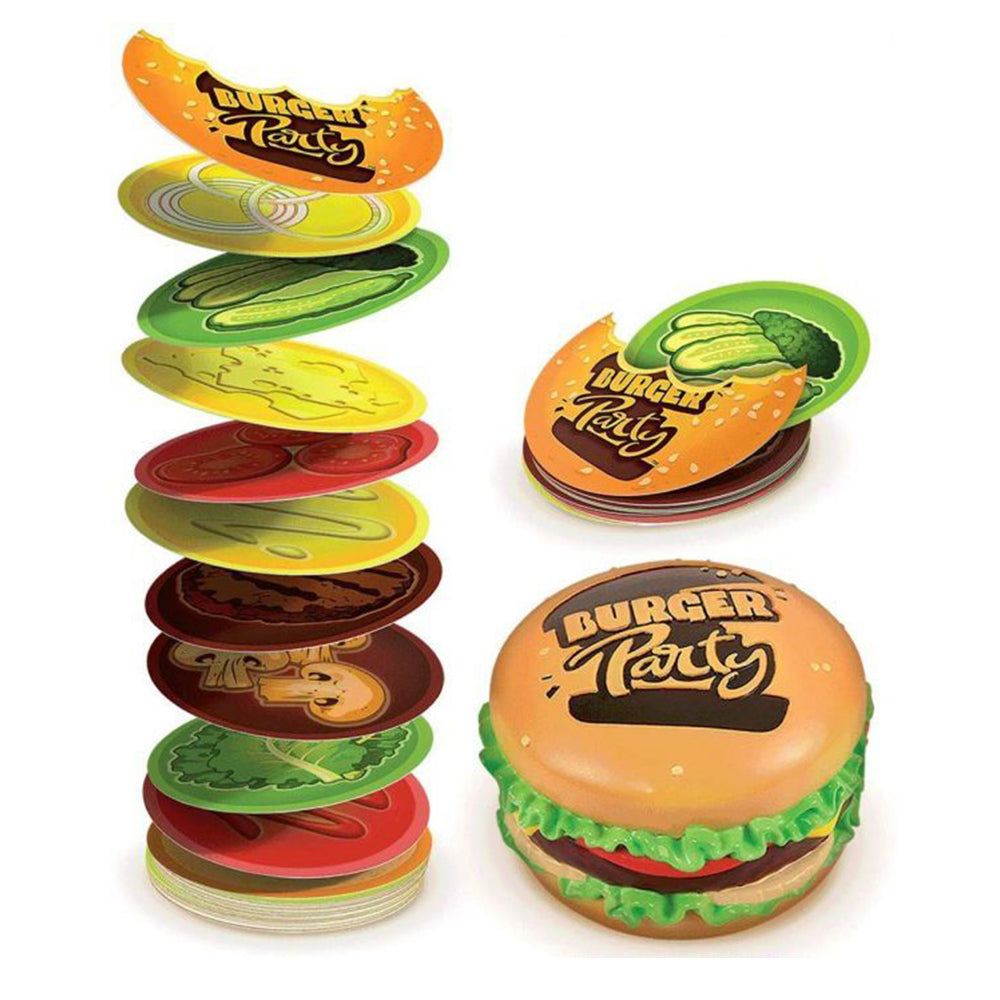 Things are heating up in the kitchen, with this fast-paced burger building card Game. Stack your ingredients and build the biggest burger to win. Quickly slap the burger whenever you see matching cards to claim more ingredients. Burger party is the perfect party game that provides endless fun for everyone. With an easy to learn gameplay it’s a perfect gift for the kids.