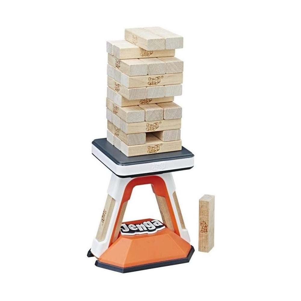 - Includes 27 hardwood Jenga blocks with resealable plastic storage bag, passing platform, stacking stand, and instructions.
