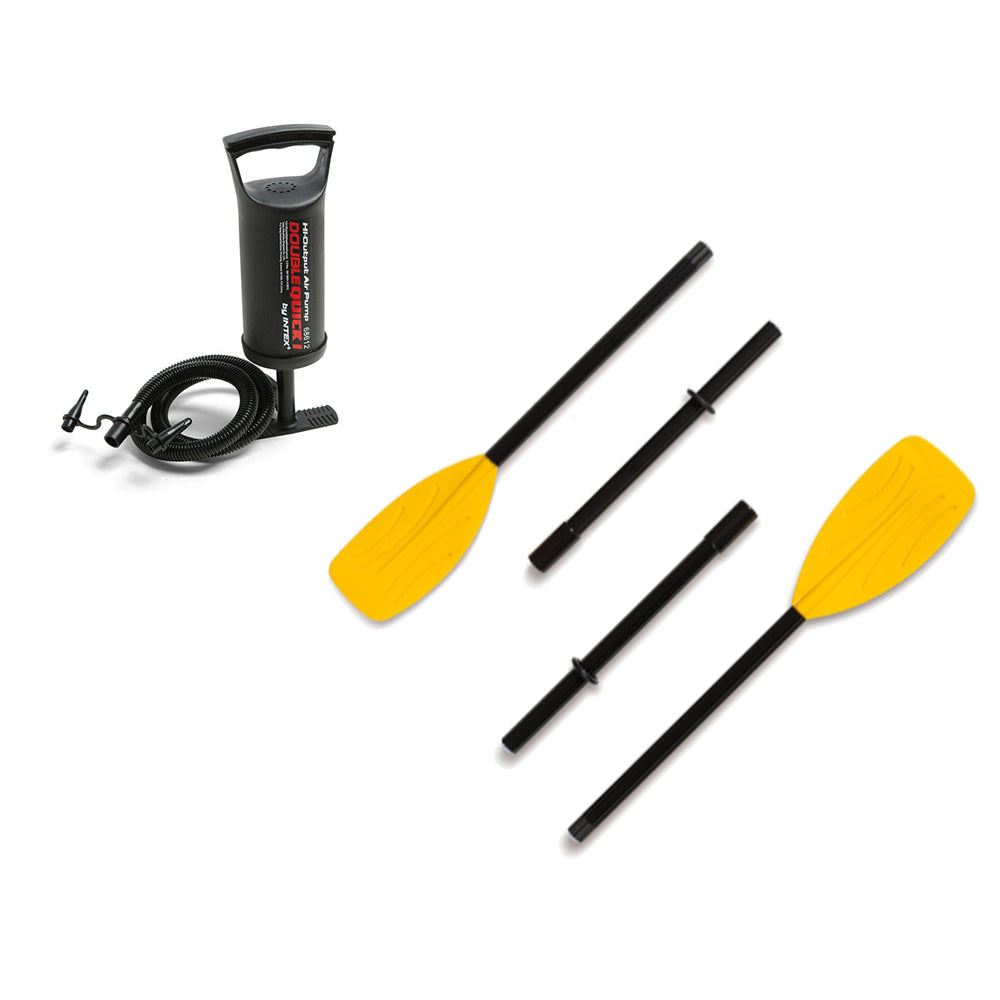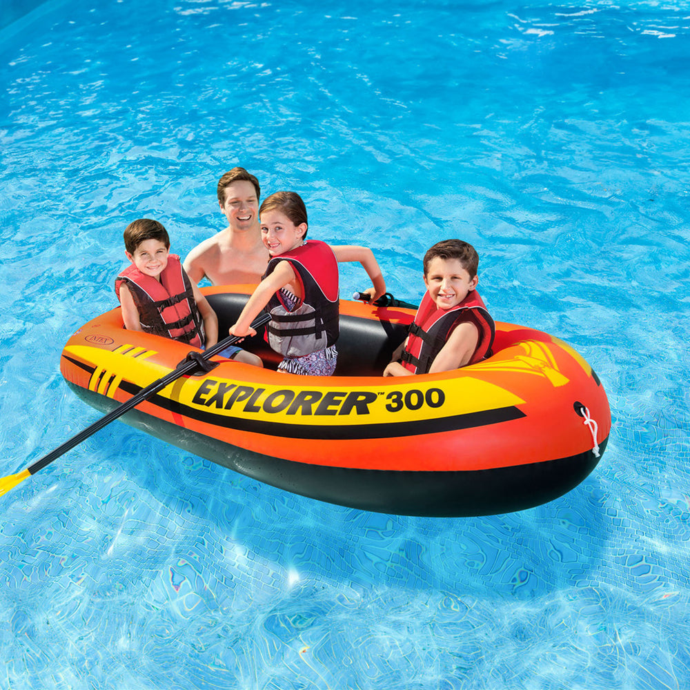 Have a boat race with friends or leisurely cruise around the pool on lazy summer days with the 3-Person capacity Intex® Explorer™ 300. This super bright boat features a grab rope on the bow, oar locks and a soft inflatable floor for easy cruising. Set comes complete with 48in Deluxe Aluminum Oars and a Mini Hand Pump.