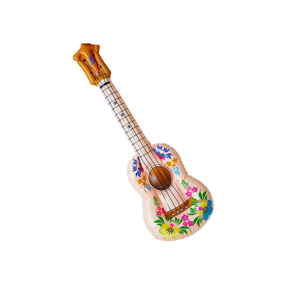 The sun is shining, the ocean is roaring and you can feel the hot sand between your toes. Beautiful hula girls sway to exotic sounds against a breathtaking beach backdrop. The sound of the sea is accompanied by cheerful laughter. People make music together. It smells of faraway places... Fancy a vacation? Sit on the white sandy beach with good friends and play a relaxing song on your guitar. You can bring the Caribbean home with the Hawaiian inflatable guitar. Decorate your location with hula chains and palm trees, and use our beautiful air-filled ukulele as a costume accessory & Hawaiian party decoration. The Hawaiian inflatable guitar makes an excellent beach party decoration and is a creative decoration idea for your cheerful and colorful Hawaiian party.