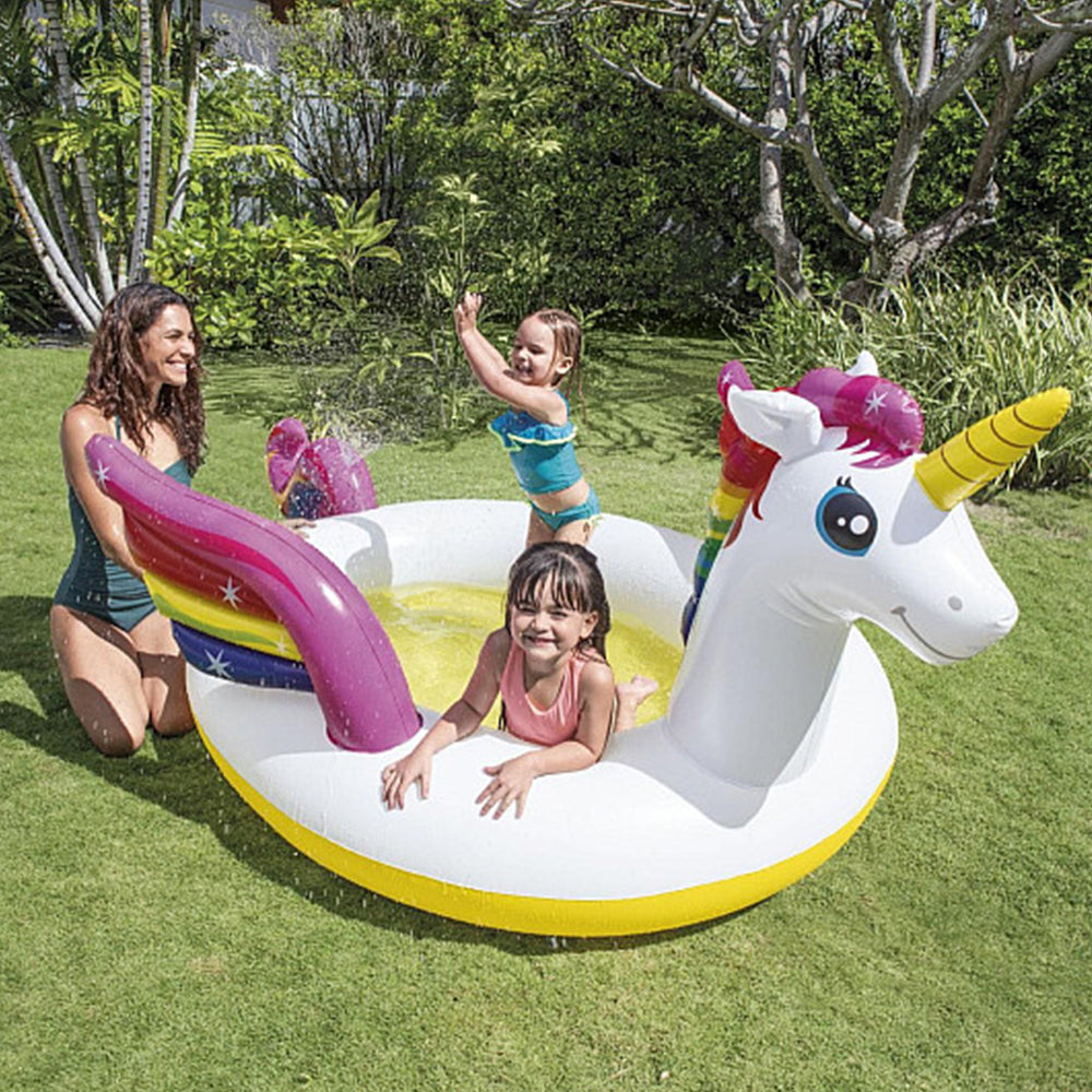 If you like unicorns, we recommend the Intex children's inflatable pool with a shower in the UNICORN design. For the shower to work, just connect it to the garden hose. The shower is guided by a unicorn's tail.