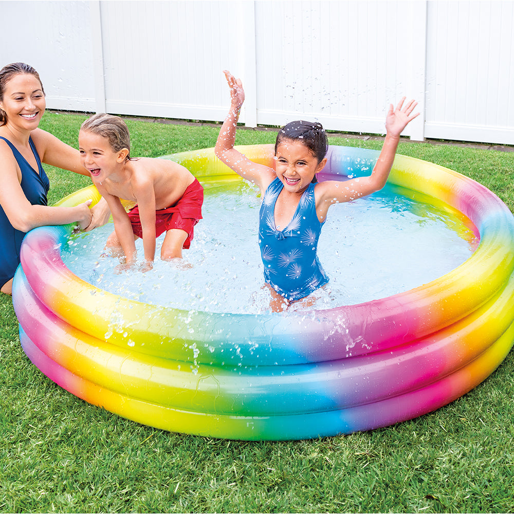 Cool down in your own back garden with the Intex Sunset Glow 4-Ring Paddling Pool. This fun kids’ paddling pool is created with thick, durable plastic for long-lasting outdoor use. Designed with 4 inflatable rings, the Intex Sunset Glow 4-Ring Paddling Pool sets up easily in any back garden for summer fun outdoors.