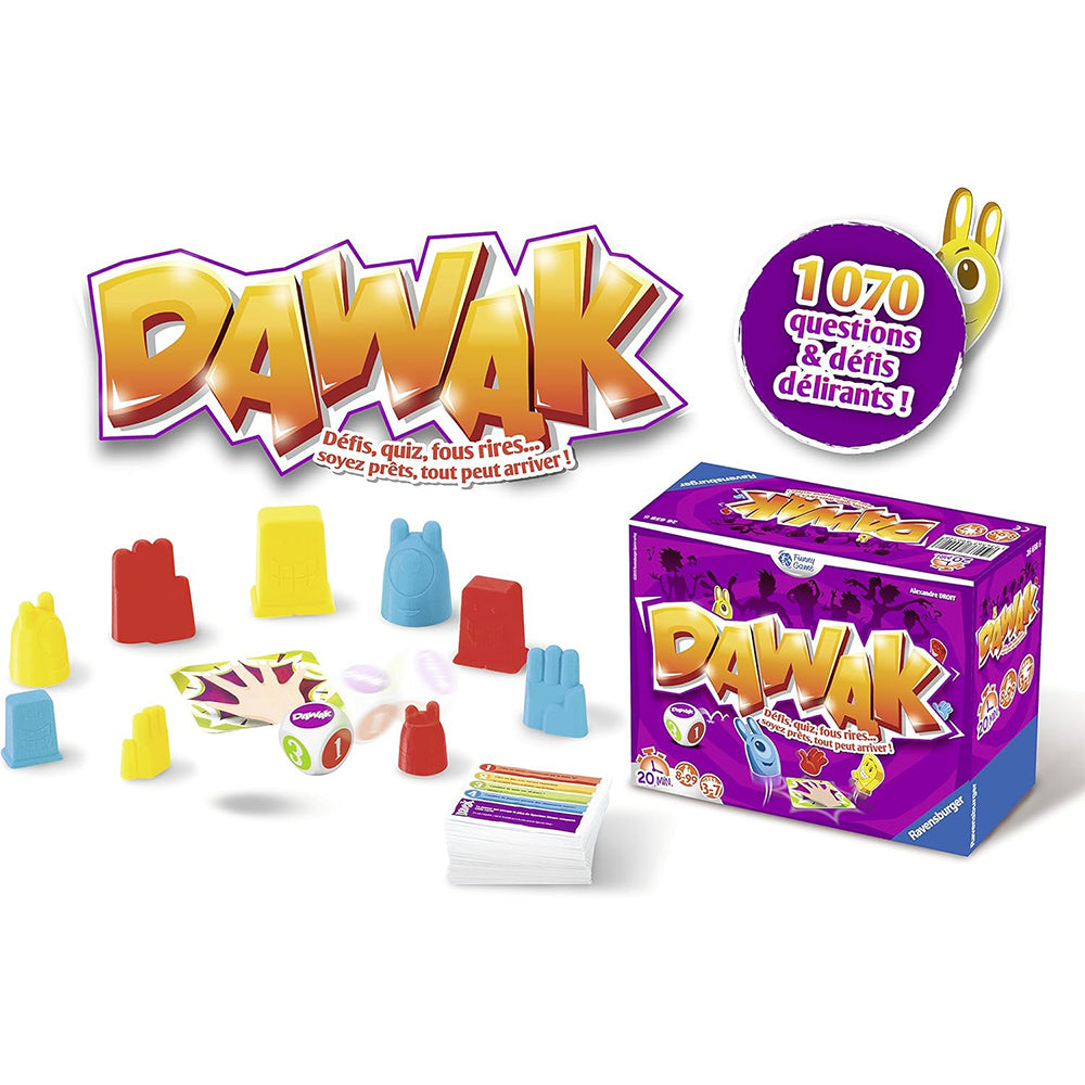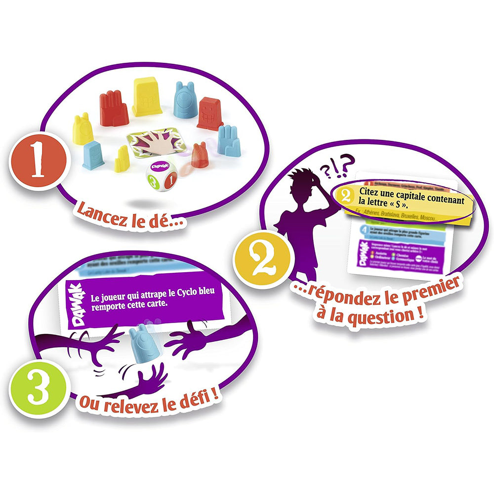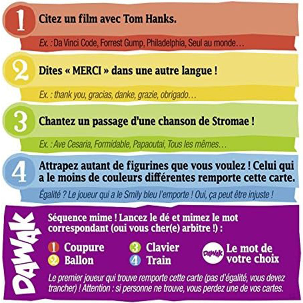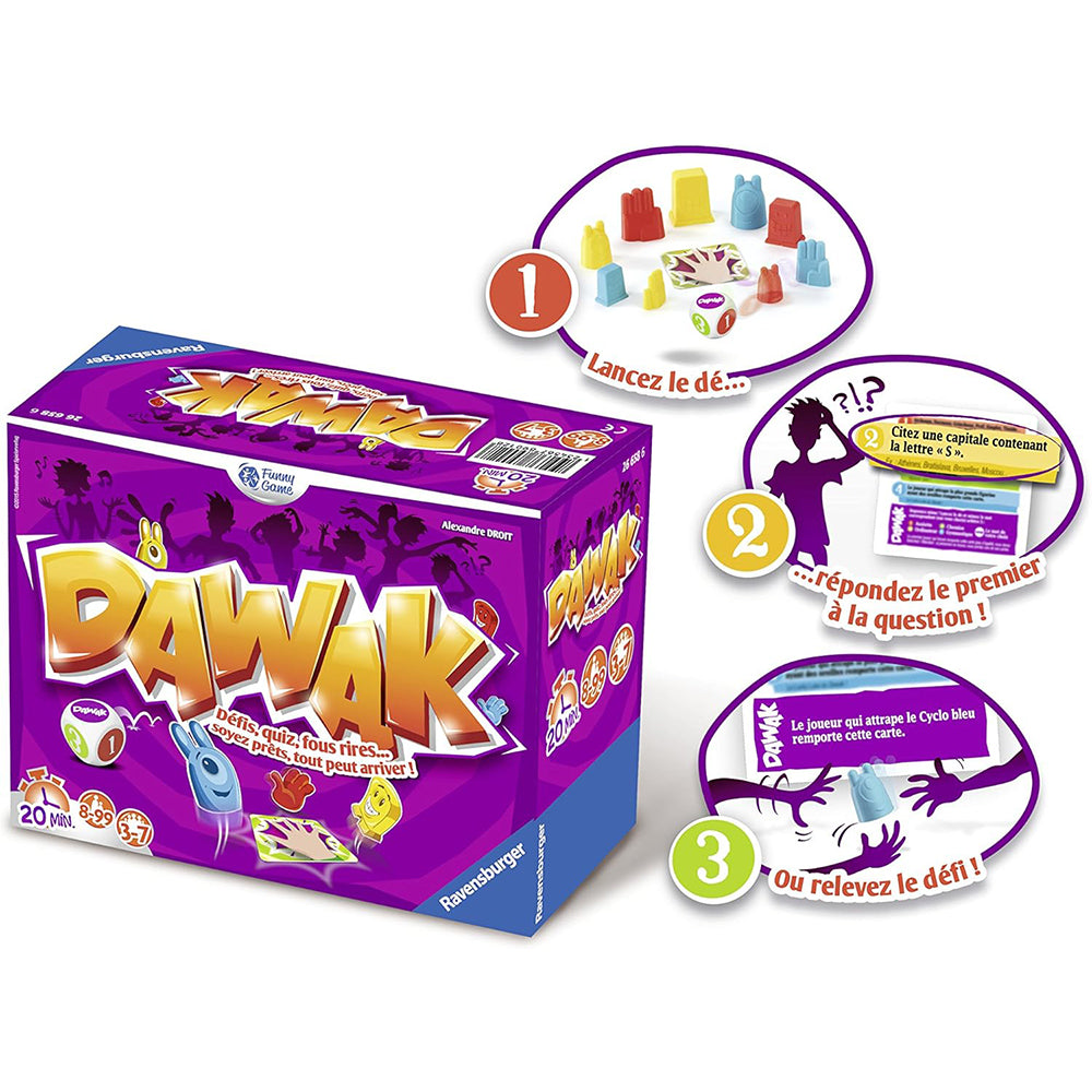 Start the cube... You know play. Round, the cube determines which question: cinema, history, comic, everyday life, no matter what questions. "Choose an album from Tim" "How many" J "The Word" Magic "?" "How is the item hidden behind these letters N O C gives R? "name a word begin the letters" P "and end it with the letter "N". The faster, gets the card. But it on your: at one time or another, it must catch figures in the middle of the table... and when you have a side "Dawak" the big everything begins: the challenges, of singing, the costume... a Macedonia, challenges fun and different for Sides délirant it. No one knows what can happen. Are you ready to do everything you need to do to 7 cards firstly? "Dawak board game, easy and fast, for laughter and relax with family or friends.