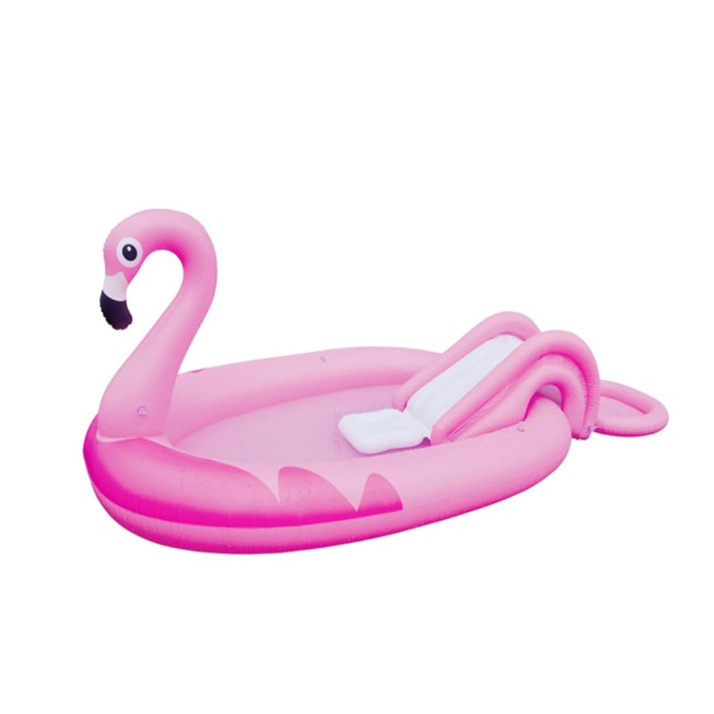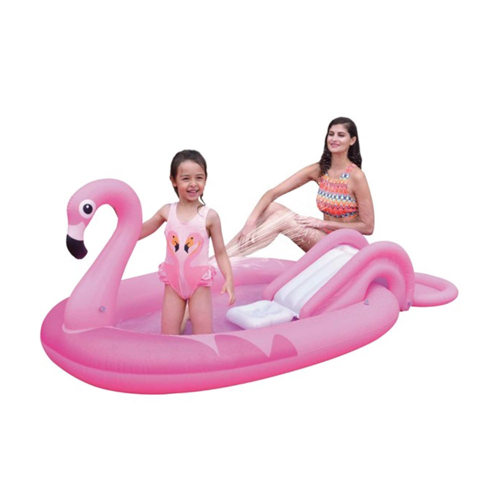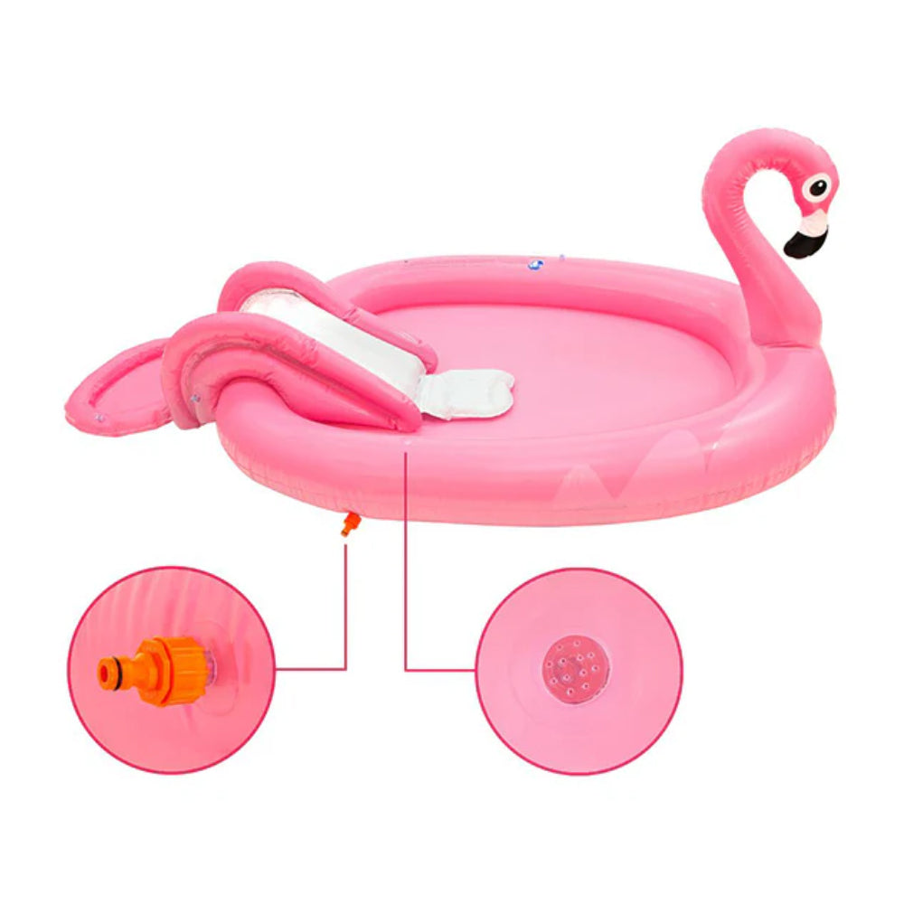 Sun Club is pleased to present this inflatable paddling pool with water spray and inflatable slide in a fun and colorful pink flamingo design. Attach your garden hose to the paddling pool to make water spray straight from the side of the pool, and splash into the water from the inflatable slide. Made from durable and hard-wearing vinyl this inflatable paddling pool is sure to last for many summers ahead. Sun Club has a huge range of inflatable pool toys, paddling pools, and other summer accessories.